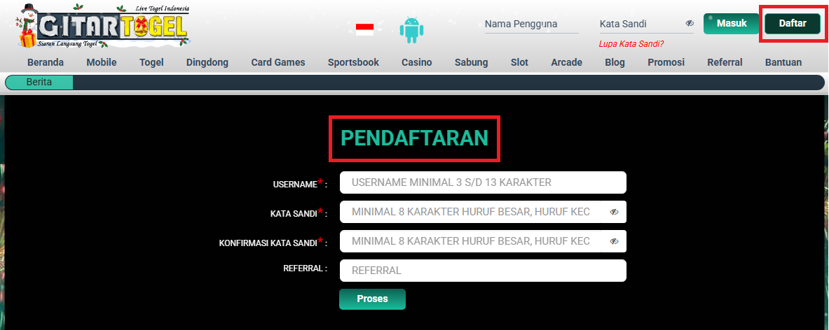 Anda harus melakukan Pendaftaran terlebih dahulu pada situs GITARTOGEL.COM dengan klik menu DAFTAR yang tersedia di halaman depan situs kami lalu silakan isi data-data yang diminta dengan benar.